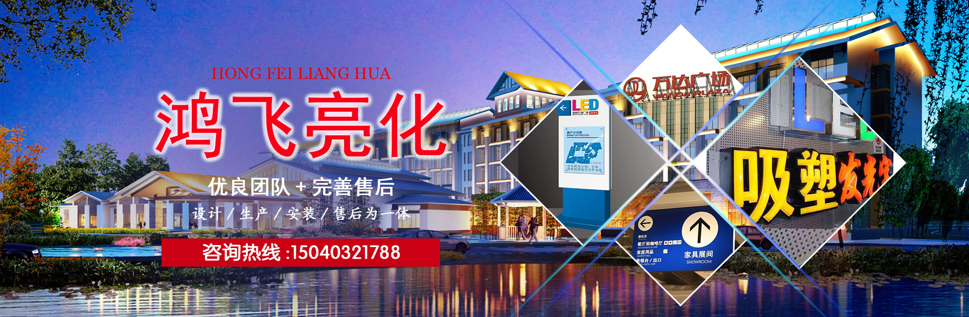 ABOUT沈陽鴻飛亮化有限公司,成立于2009年,注冊(cè)資金200萬,本公司專業(yè)從事樓體亮化、LED發(fā)光字、樓頂大字、鋼結(jié)構(gòu)工程,是一家集設(shè)計(jì)、生產(chǎn)、安裝、售后為一體的綜合型公司。公司在不斷的拓展和創(chuàng)新過程中取得了沈陽市城鄉(xiāng)建設(shè)委員會(huì)頒發(fā)的城市及道路照明工程叁級(jí)資質(zhì),AAA級(jí)信用等級(jí)證書等一系列榮譽(yù)。自公司成立以來,活躍于各個(gè)行業(yè),為多家大型企業(yè)提供廣告解決方案,并多次承攬沈陽市及周邊城市亮化工程,贏得了客戶及業(yè)內(nèi)人士的一致好評(píng),取得了良好的社會(huì)效應(yīng)?! 」緭碛歇?dú)立廠房,配備了一系列的先進(jìn)生產(chǎn)設(shè)備,并且擁有一支技藝精湛素質(zhì)優(yōu)良的團(tuán)隊(duì),真誠的為廣大客戶服務(wù)。以誠信謀生存,以質(zhì)量求發(fā)展。沈陽鴻飛亮化有限公司全體員工將以無限的熱情,精湛的技術(shù)為廣大客戶服務(wù)。..